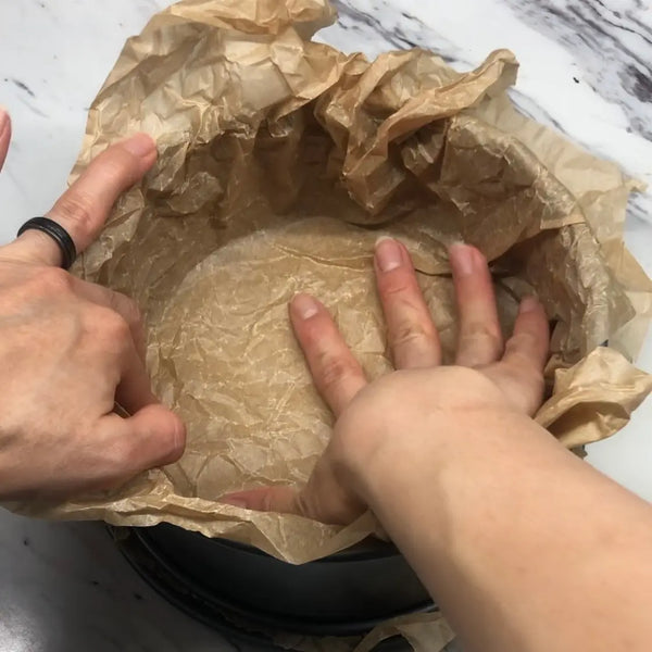 在彈簧盤的底部鋪上一小片羊皮紙。對於頂部,請使用一大張羊皮紙。為了更容易使用,請將羊皮紙揉成球狀,然後將其鋪入烤盤中。