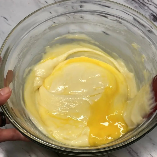 用叉子或筷子敲碎並攪打雞蛋。將雞蛋混合物分批倒入麵糊中,中間攪拌。