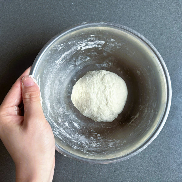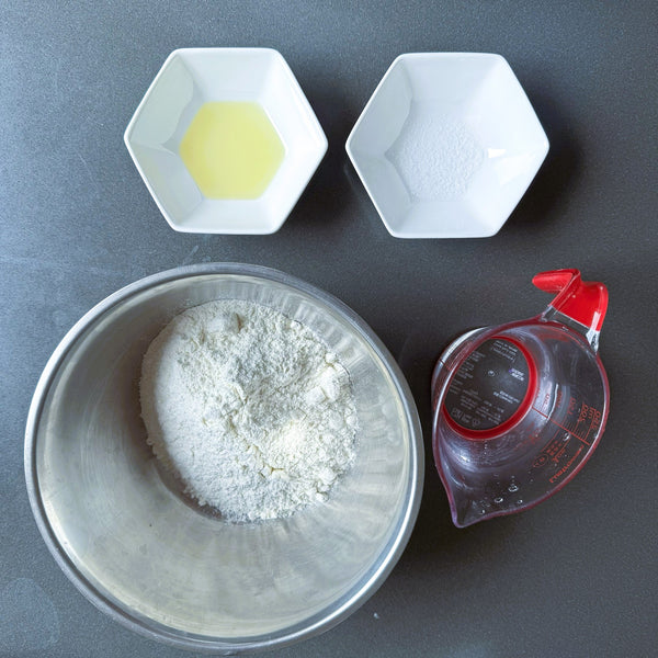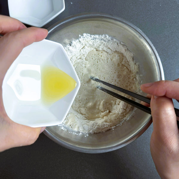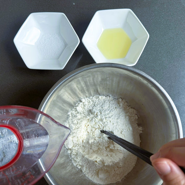 將油、鹽和溫水加入麵粉中。首先用筷子或湯匙輕輕混合所有東西,直到食材開始混合在一起。一旦混合物開始黏稠,用手輕輕揉捏直至形成麵團。用保鮮膜蓋住麵團,防止其變乾,靜置約 30 分鐘。別擔心,表面不需要光滑。