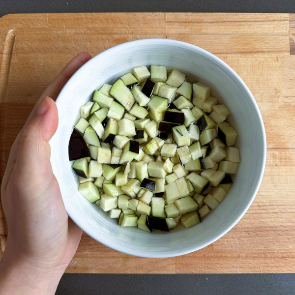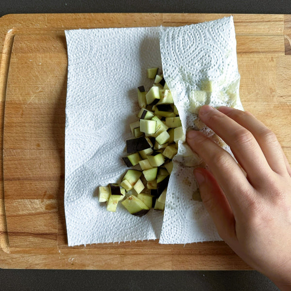 將茄子切成方塊並在水中短暫浸泡。浸泡後,用紙巾將茄子徹底拍乾。確保除去盡可能多的水;過多的水分會導致油炸過程中油濺出,從而導致灼傷。