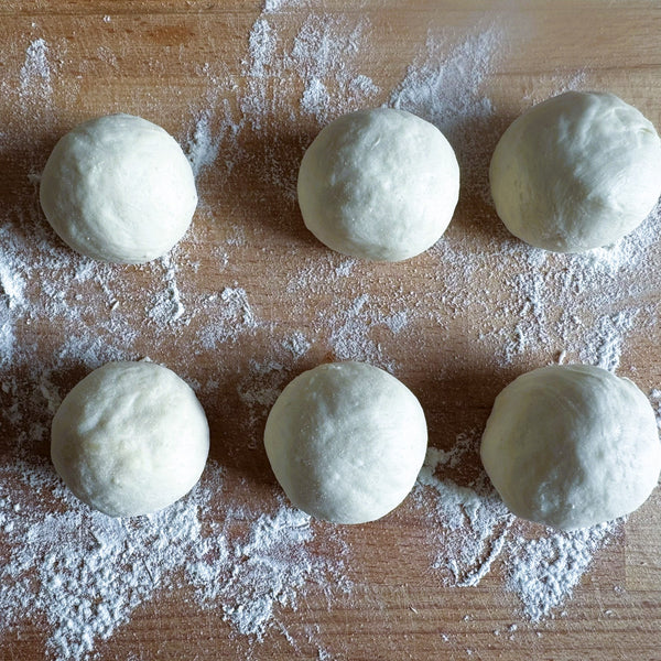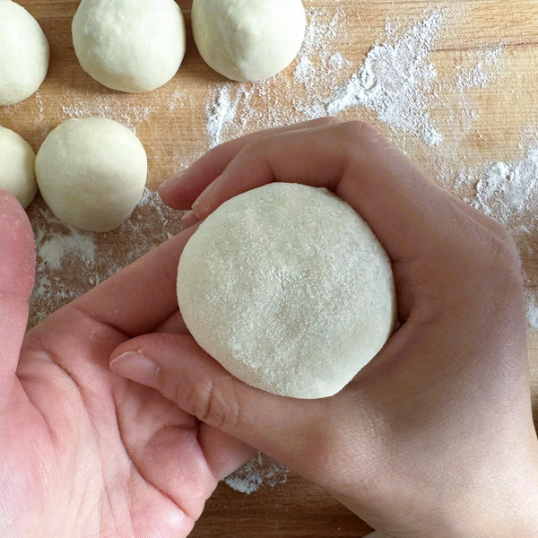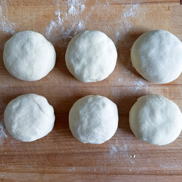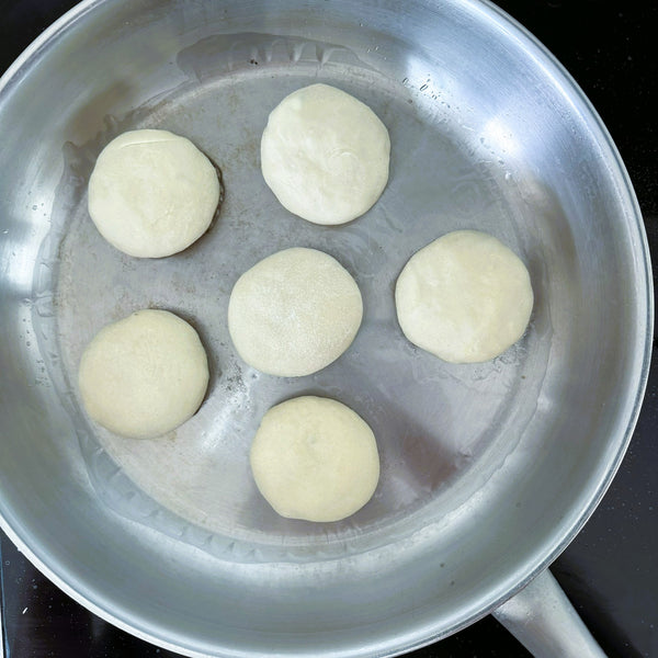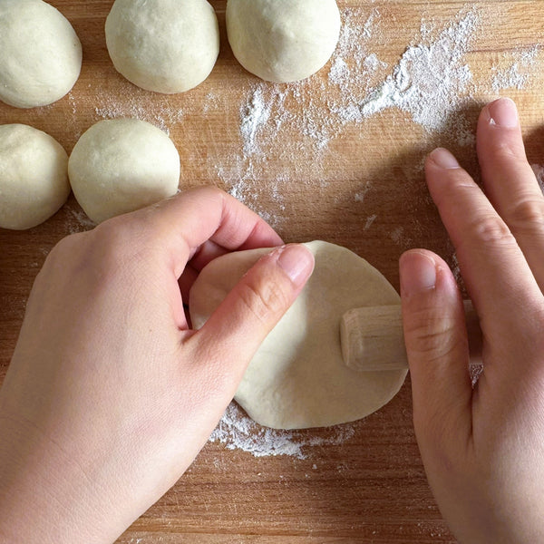 將麵團分成六等份,然後將每份擀成圓形。滾動時,保持中心比邊緣稍厚。旋轉麵團時輕輕拉伸麵團,使其形成均勻的圓形形狀,以便很好地固定餡料。