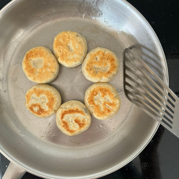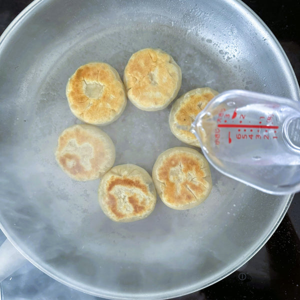 加熱煎鍋並加入少許油。將禦燒放入鍋中,煎至一面變成金黃色。煎至焦黃後翻面,加入約50毫升水,蓋上鍋蓋蒸。這種技術使燒餅的外表酥脆,同時確保餡料完全煮熟且柔軟。