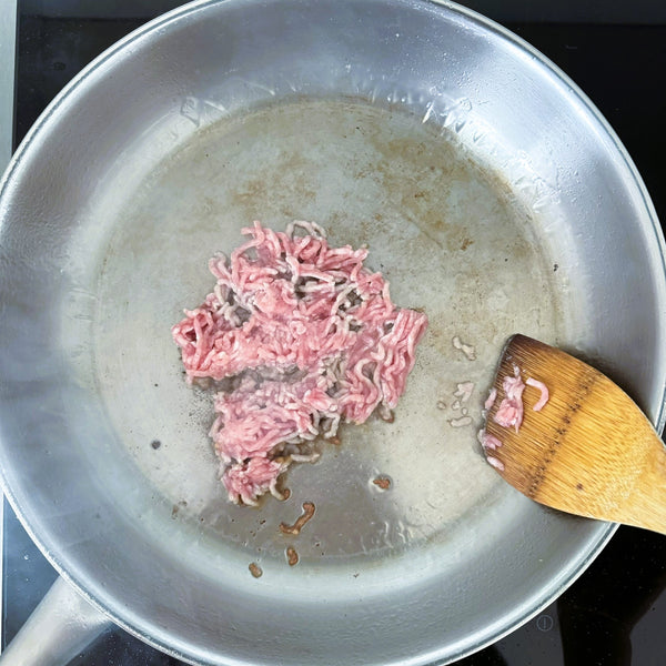 加熱煎鍋並加入少許油。加入碎肉,煮至變色。然後加入茄子丁和調味料(味噌、糖和味醂),攪拌均勻。繼續用中火煮,直到所有東西都徹底煮熟。完成後,將餡料轉移到盤子上並在使用前冷卻。