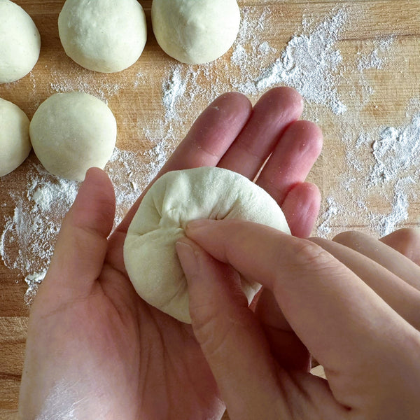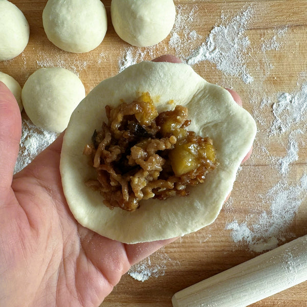 將茄子味噌餡分成六份,並將一份放在每個麵團上。小心地將麵團包裹在餡料周圍,用手指將接縫捏在一起以密封。把包好的餃子翻過來,輕輕地把它擀成圓形,確保餡料牢牢包住。