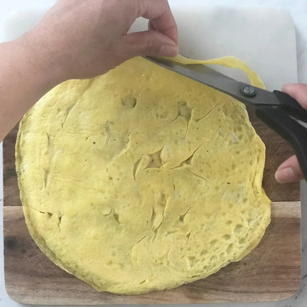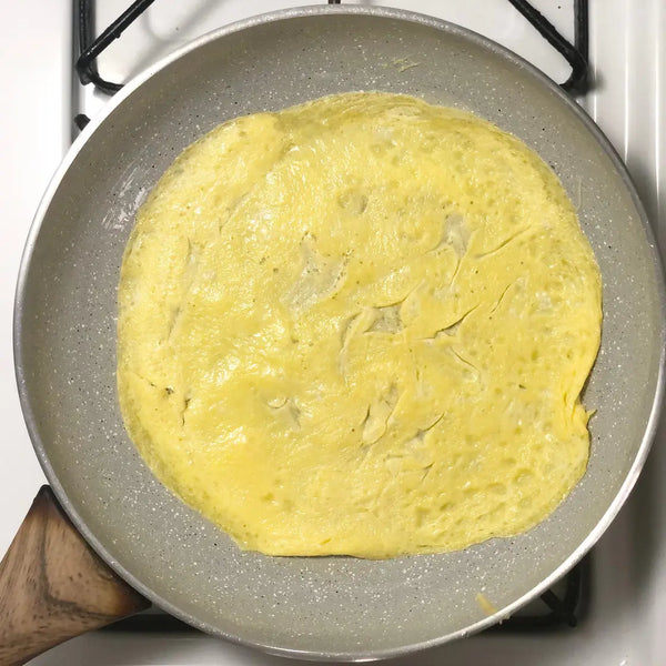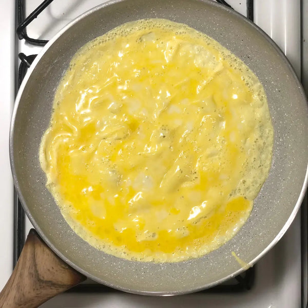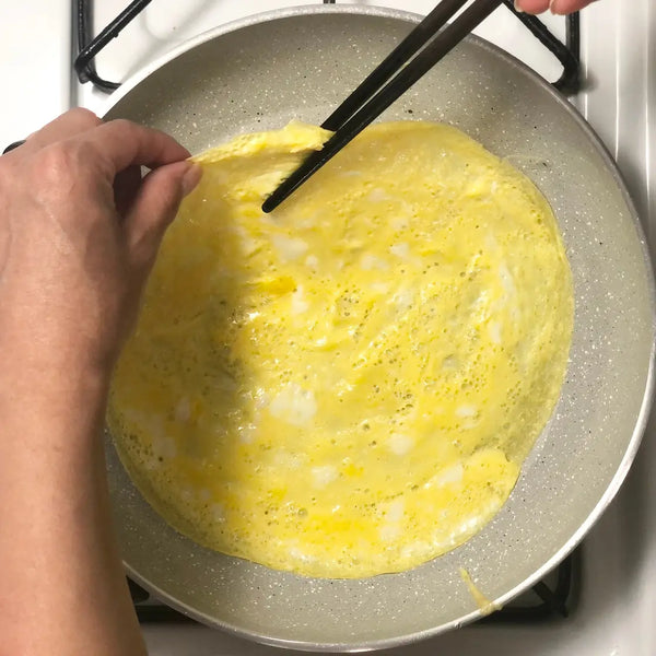 將打散的雞蛋倒入鍋中,形成薄薄的一層。不要一次將全部雞蛋混合物倒入!煮至蛋凝固但頂部仍略濕。用鍋鏟或筷子將雞蛋「煎餅」翻過來。將另一面短暫煮至完全凝固。 (這只需要幾秒鐘。)