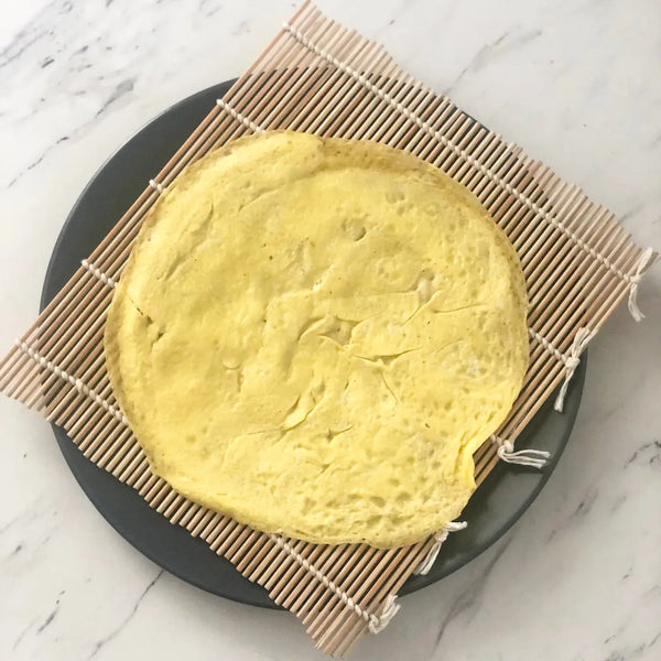 將煮熟的雞蛋轉移到切板上,或將壽司捲墊放在盤子上,讓其冷卻。重複此過程,直到所有雞蛋混合物都煮熟。