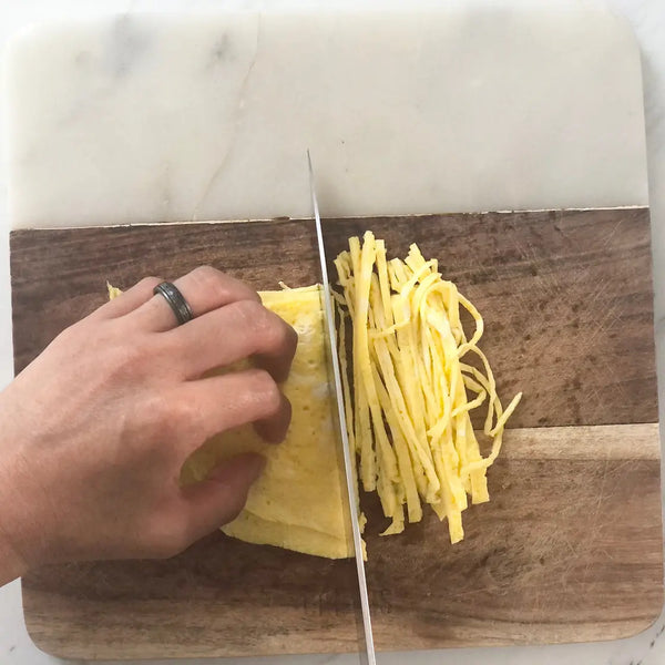 將雞蛋縱向切成細條。