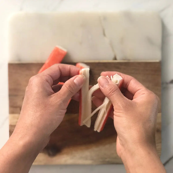 將其他配料(黃瓜、火腿和仿蟹)切成與金絲玉子大小相似的細條。將番茄切成楔形。