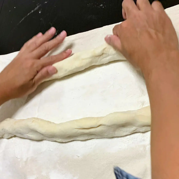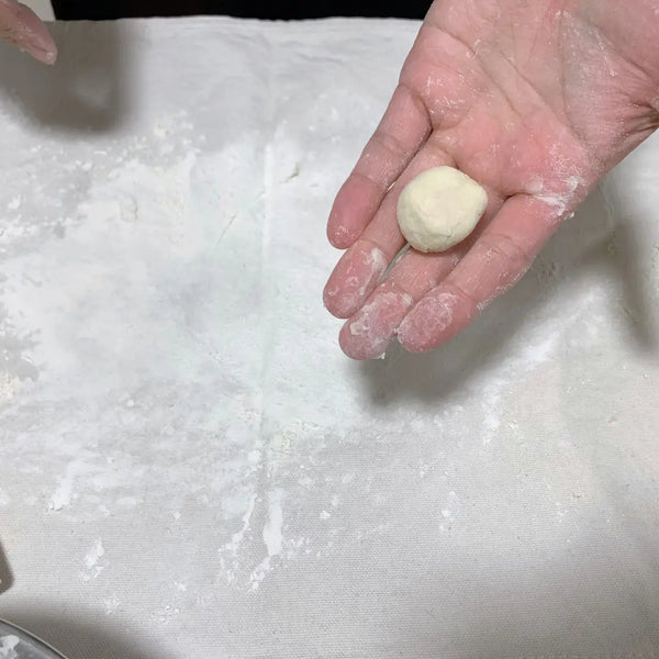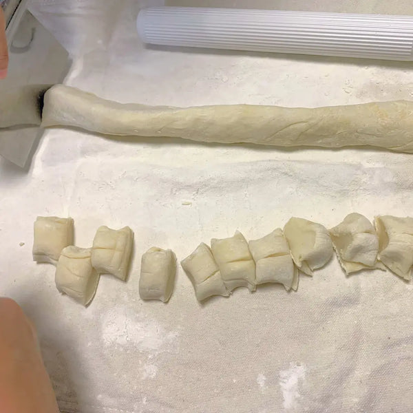 在墊子或木板上撒上大量麵粉(不包括配方量),然後將餃子麵團從碗中取出。將麵團分成兩等份,然後將其拉伸成長圓柱形的塊狀。然後,使用台式刮刀從每個圓柱體上切出 10 等份。