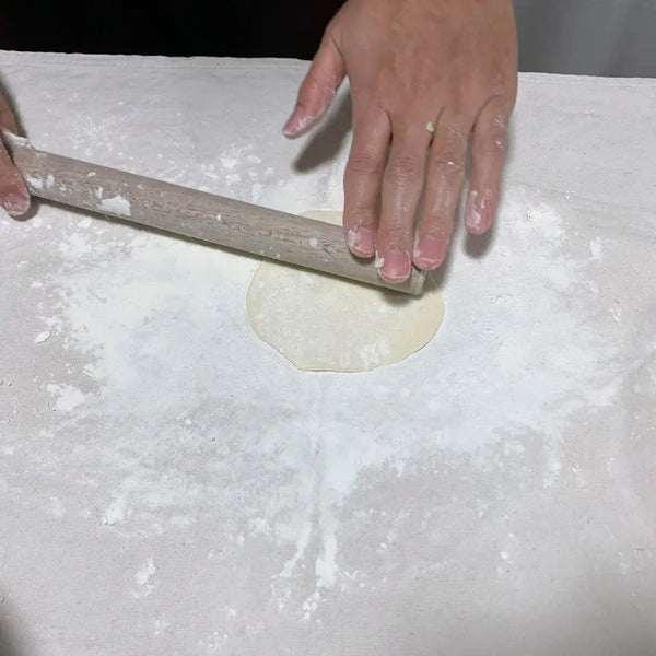 取出每個切下來的碎片並將其捲成一個球。然後,用手指和擀麵杖將其擀成12公分的圓形。 (如果包裝紙看起來黏在一起,每次都撒上麵粉)。