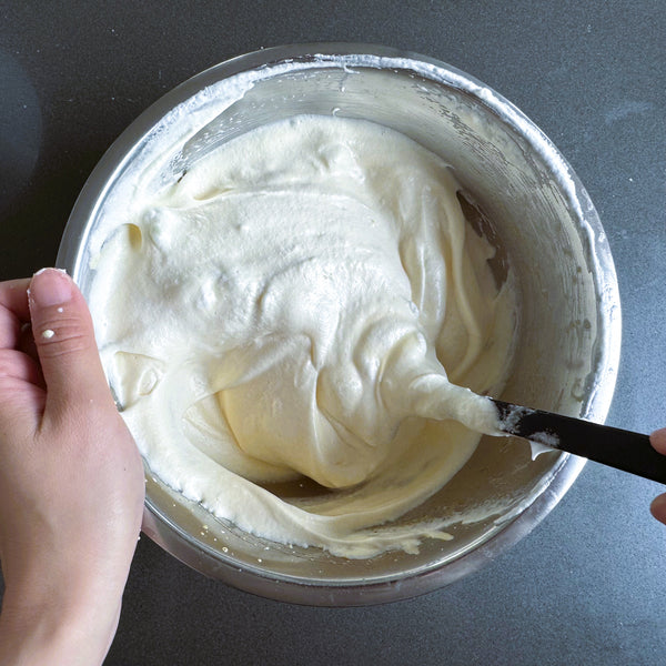 將蛋白酥皮加入蛋黃混合物中。與一個混合 鏟子,一下子從底部舀起,小心不要把蛋白霜弄破。