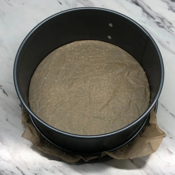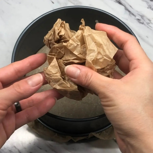 在彈簧盤的底部鋪上一小片羊皮紙。對於頂部,請使用一大張羊皮紙。為了更容易使用,請將羊皮紙揉成球狀,然後將其鋪入烤盤中。