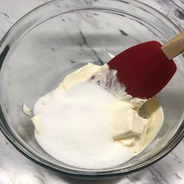 將奶油乾酪和糖放入大碗中。將它們撫平,直到所有腫塊都消失,就像將它們搗碎在一起一樣。