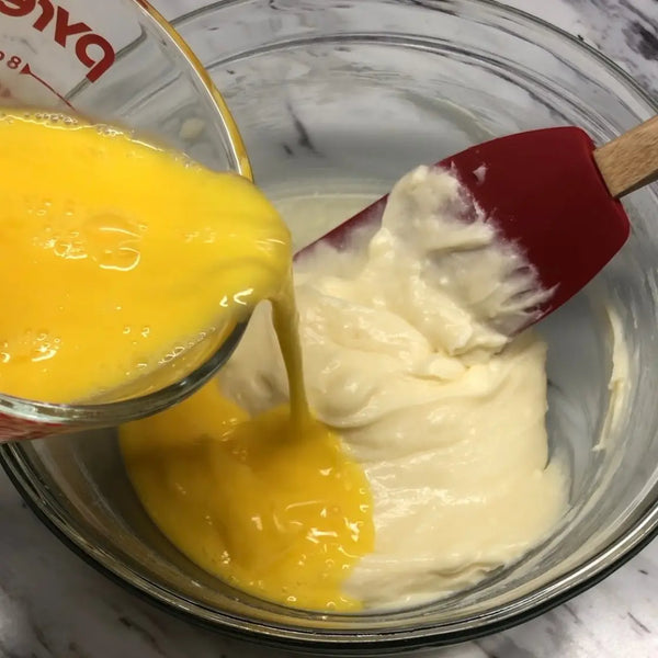 用叉子或筷子敲碎並攪打雞蛋。將雞蛋混合物分批倒入麵糊中,中間攪拌。