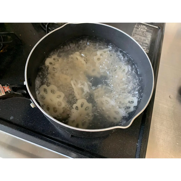 將500毫升水放入鍋中,煮沸。加入1茶匙醋(食譜中未包含),然後將蓮藕片放入鍋中。將蓮藕煮3分鐘。