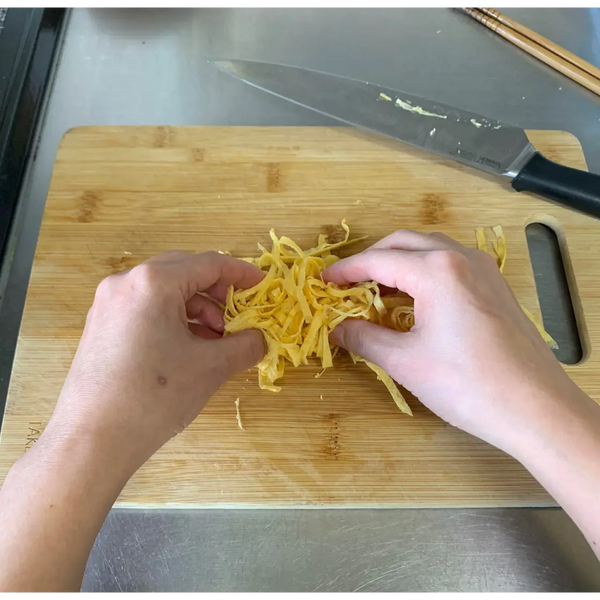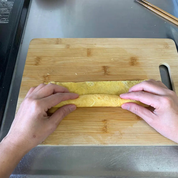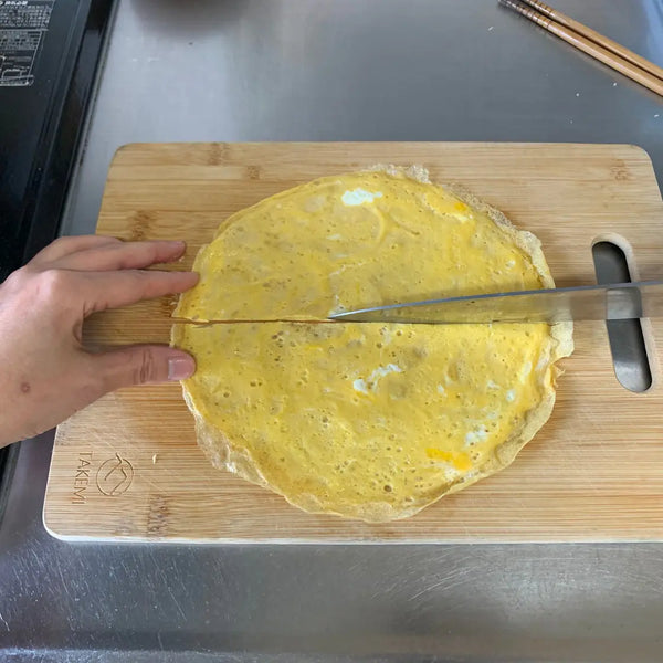 將捲好的雞蛋轉移到切菜板上,首先將其縱向切成兩半。然後,將每半卷緊緊捲起來,切成距邊緣約1~2毫米的細條。最後,用手將條子分成小塊。
