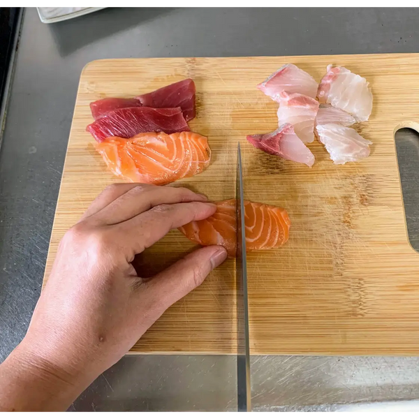 將生魚片切成一口大小的塊狀。在我們的例子中,我們選擇了鮭魚、鮪魚和黃尾魚作為我們的散壽司,但也可以使用您最喜歡的生魚片類型或任何可用的類型。
