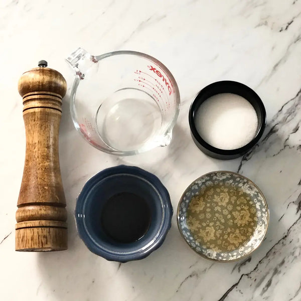 將 Hiyashi Chuka 的原料和自製調味料收集在一起。