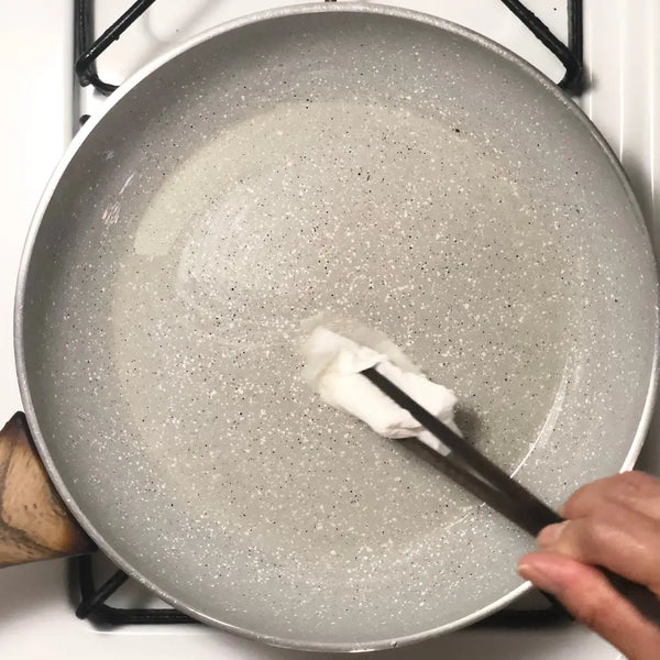用中火加熱不沾煎鍋或普通平底鍋,並塗上少許油脂。鍋內抹上油,用廚房紙將油均勻地抹勻。