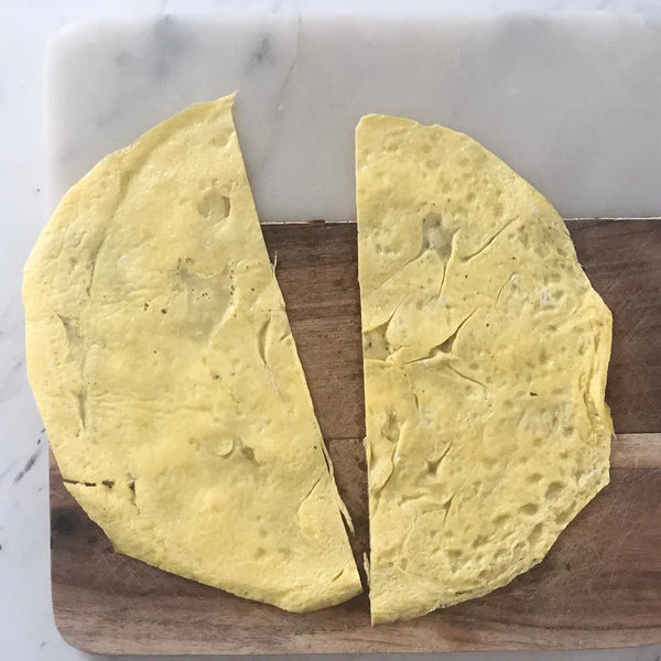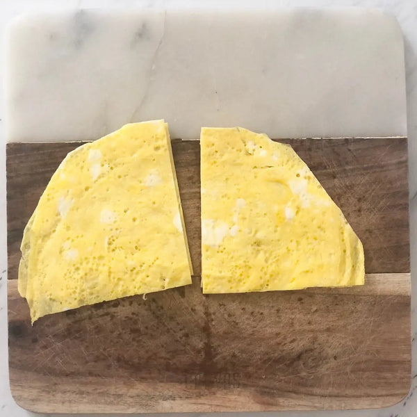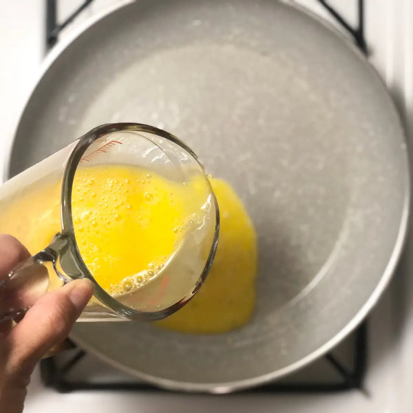 將打散的雞蛋倒入鍋中,形成薄薄的一層。不要一次將全部雞蛋混合物倒入!煮至蛋凝固但頂部仍略濕。用鍋鏟或筷子將雞蛋「煎餅」翻過來。將另一面短暫煮至完全凝固。 (這只需要幾秒鐘。)