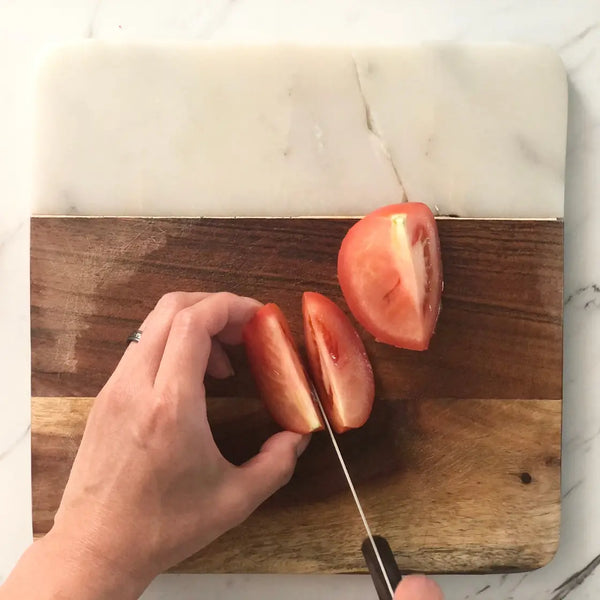 將其他配料(黃瓜、火腿和仿蟹)切成與金絲玉子大小相似的細條。將番茄切成楔形。