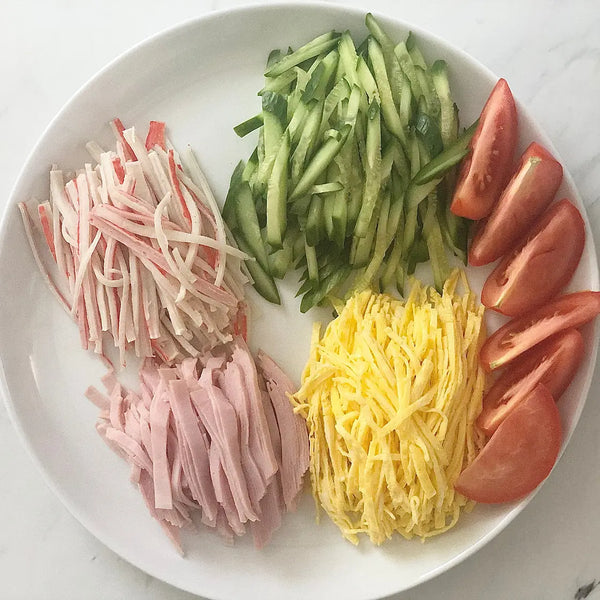 我們不要忘記美味的 Kinshi Tamago(煎蛋捲絲)!切碎的金絲玉子條帶來一絲優雅,並為您的菜餚增添令人愉悅的質感。它們就像金色的小絲帶,讓您的 Hiyashi Chuka 更加閃亮。