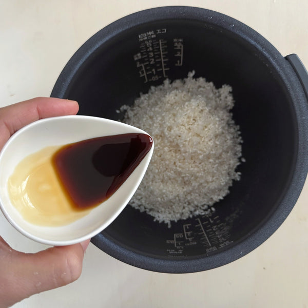 調味料—— 四郎高湯: 濃縮湯底由 鰹魚, 海帶、醬油和味醂。它為米飯添加了均衡的鮮味和清淡的調味料,而不會使其顏色變暗太多。