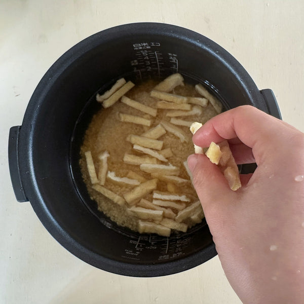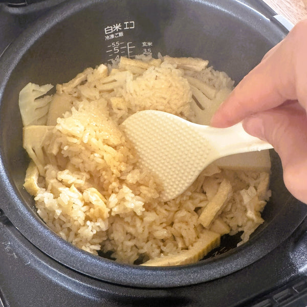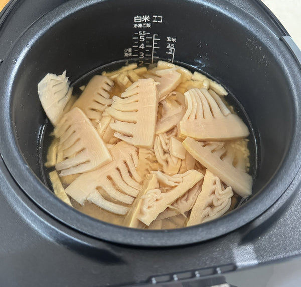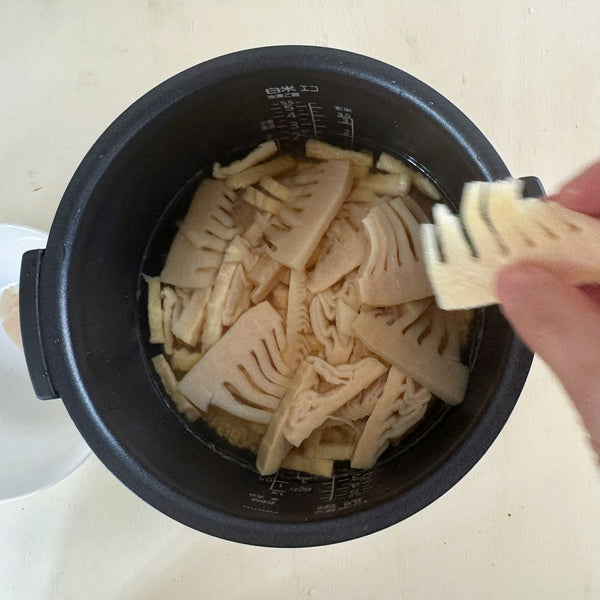 - 烹飪前請勿混合食材: 將竹筍和油菜放在米飯上,讓它們在煮飯時輕輕地蒸煮。