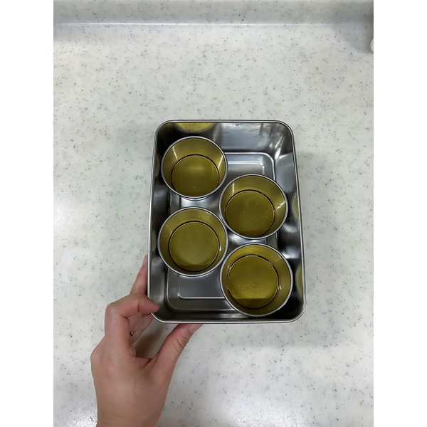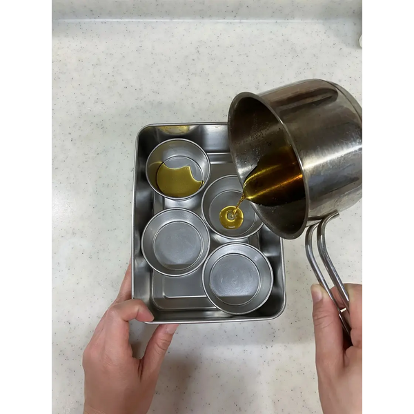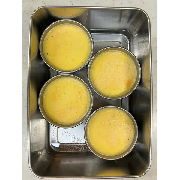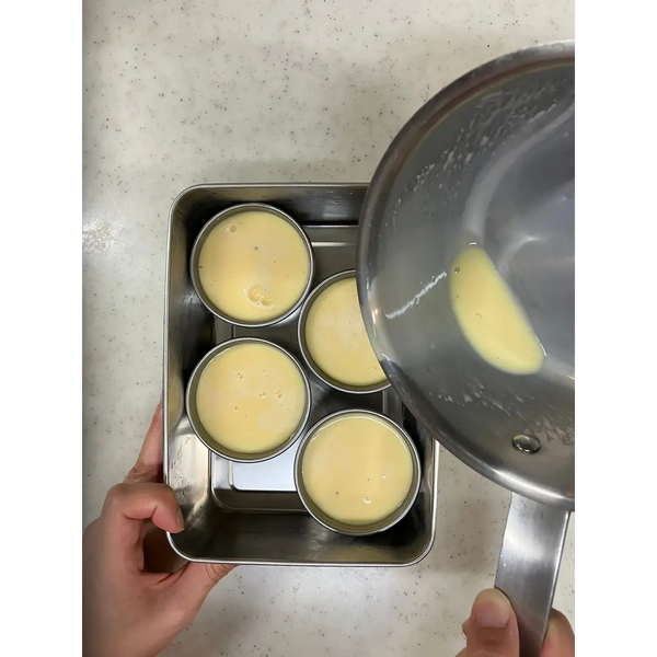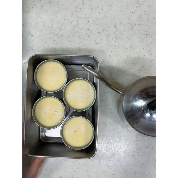 將蛋奶凍混合物均勻地分入模具中。將模具放入烤箱安全容器中,然後在容器中添加約 2 公分(0.8 英吋)的熱水。在 150℃ (302℉) 下烘烤 35-40 分鐘。