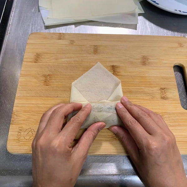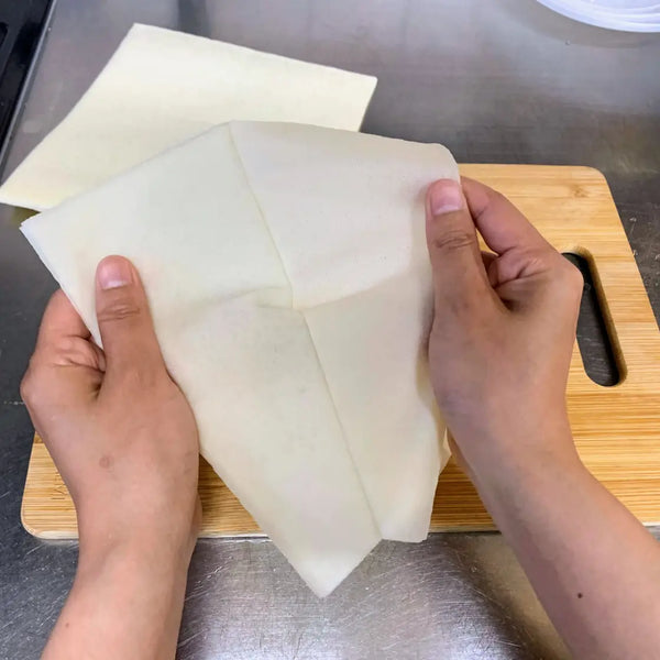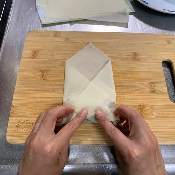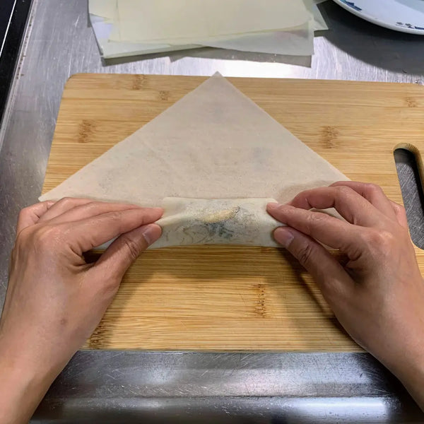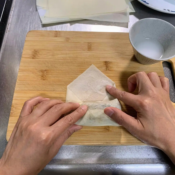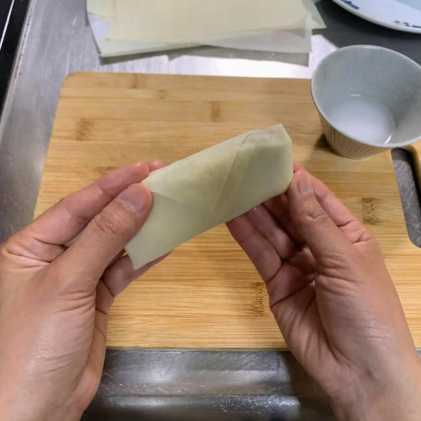 接下來,將左右角折起來,形成一個口袋,然後繼續將蛋捲向遠離您的方向滾動,直到到達頂角。密封之前,用水輕輕潤濕頂角以幫助其黏合。這項技術可確保您的蛋捲被牢固地包裹起來並準備好煎炸或烘烤,從而輕鬆享受美味的自製春捲!