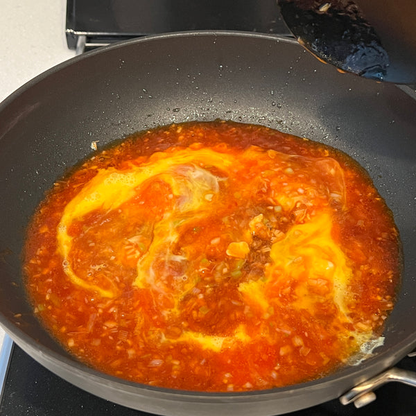 為了讓辣味變得醇厚 豆瓣醬,他補充道 番茄醬。這帶來了微妙的甜味、濃烈性和鮮味,使蝦辣椒適合所有年齡。辣度可以輕鬆調節,同時保持菜餚的鮮亮紅色。