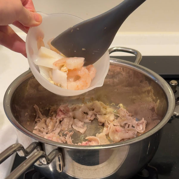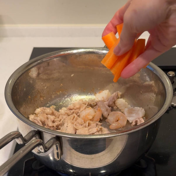 除了準備湯之外,雜燴麵的烹飪相對簡單。首先,炒豬肉、海鮮和蔬菜等原料。然後,將肉湯加入同一個鍋中。肉湯沸騰後,加入雜燴面,小火煮至完全熟透。