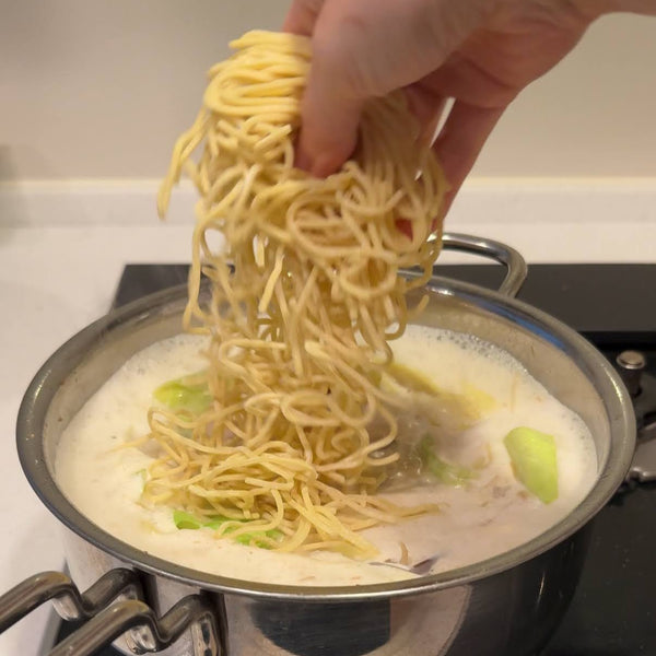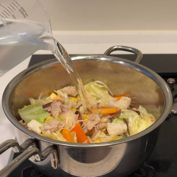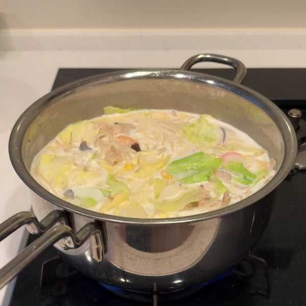 招牌乳白色湯通常由豬骨和雞湯製成。然後,這種底料與從一起烹調的各種原料中提取的鮮味相結合,形成濃鬱而濃鬱的湯。由於在家中從頭開始準備豬骨和雞湯可能非常耗時,因此許多家庭廚師選擇簡化版本。
