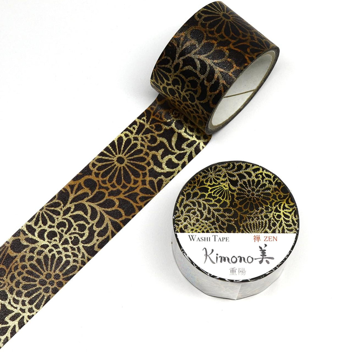 這款來自 Kamiiso 的優雅和紙膠帶採用醒目的金色菊花設計,靈感來自傳統日本和服圖案。複雜的圖案在深黑色背景上印有奢華的金色漸變,為禮品包裝、日記或工藝裝飾提供精緻、喜氣洋洋的外觀。
