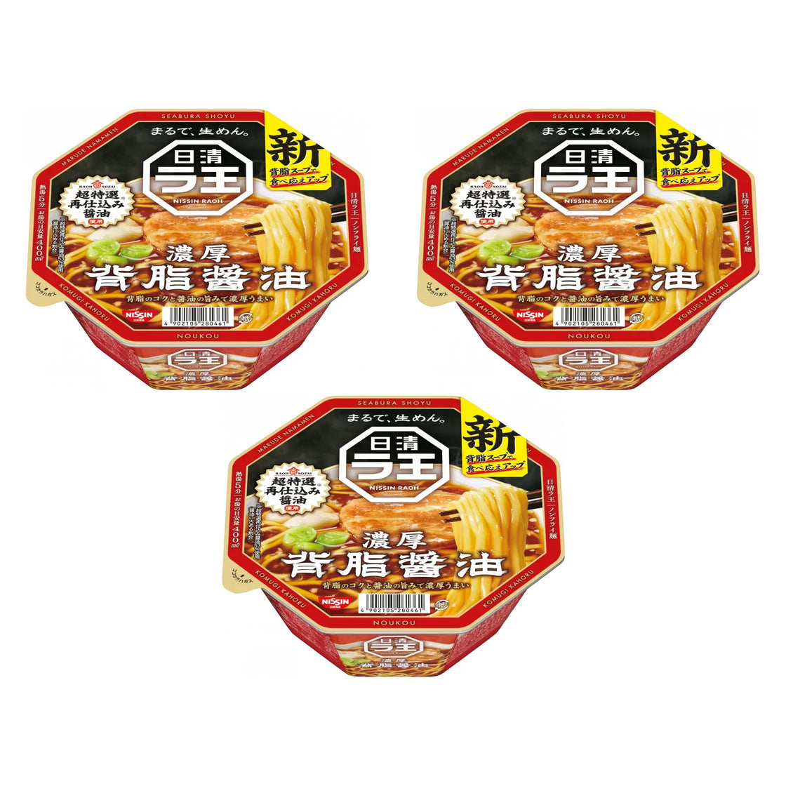 日清拉王肥背濃醬油泡麵的特點是由豬肉、蔬菜和醬油製成的濃鬱湯頭,份量可口的配料,還有一些耐嚼可口的非油炸麵條。